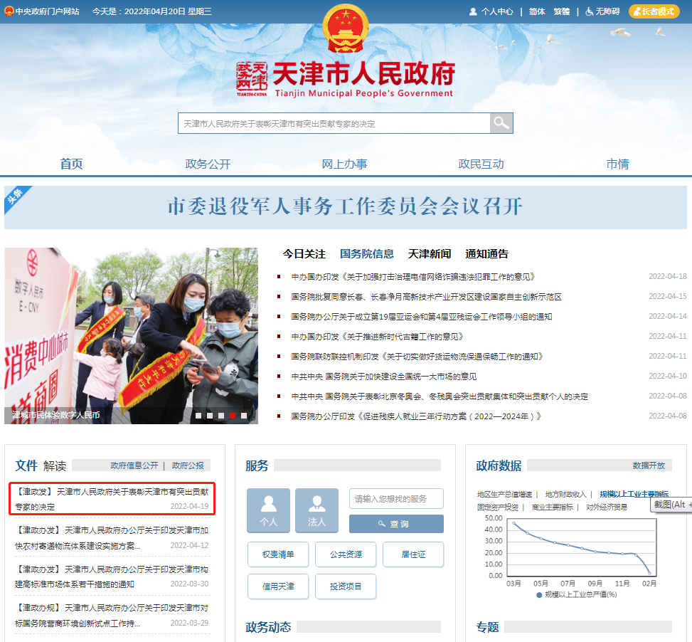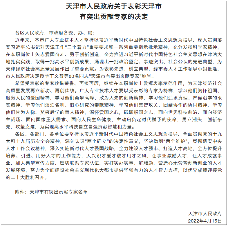 19日,天津市政务网发布《天津市人民政府关于表彰天津市有突出贡献专家的决定》