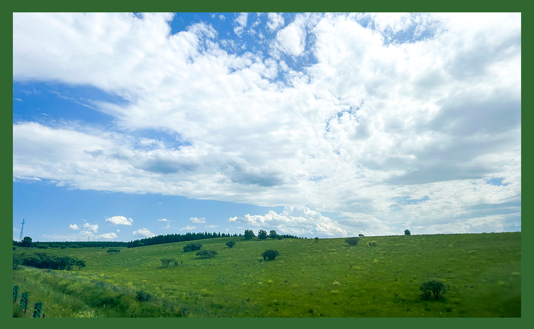 二十余辆汽车鱼贯驶入一望无际的乌兰布统草原,翠绿的草原蔓延至天际,牛群在水草边悠闲食草,远处山峦绵延,与蓝天白云构成一幅宁静优美的画卷,每到一处独特的景色,大家都停车驻足,感受草原的自由。